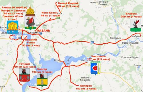 Специально для этого мы сделали карту, на которой отметили все основные направления от Казани до интересных мест (Свияжск, Раифа, Болгар, Елабуга и др). Здесь вы можете видеть, в какой стороне от Казани расположены эти достопримечательности, сколько километров ехать и сколько часов займет дорога. Расстояния считали от Кольца (центра города, откуда чаще всего вы будете отправляться на экскурсию). Пользуйтесь на здоровье! А ниже в статье мы постарались объяснить, кому куда из загородных мест стоит съездить!