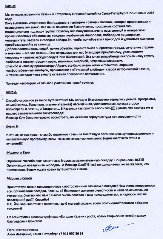 С искренней благодарностью от имени нашей большой и дружной семьи прошу руководство туристическсой компании "Загадки Евразии" отметить и поощрить гида и экскурсовода Жизневскую Юлию за прекрасное и незабываемое представление города Казани для нас (бабушки и дедушки) нашего внука - шестилетнего Дениса.
