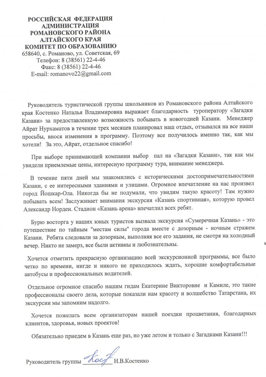 Руководитель туристической группы школьников из Романовского района Алтайского края Костенко Наталья Владимировна выражает благодарность туроператору «Загадки Казани» за предоставленную возможность побывать в новогодней Казани. Менеджер Айрат Нурхаматов в течение трех месяцев планировал наш отдых, отзывался на все наши просьбы, внося изменения в программу. Поэтому все получилось именно так, как мы хотели!