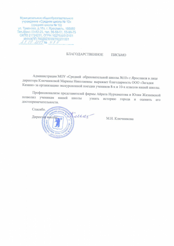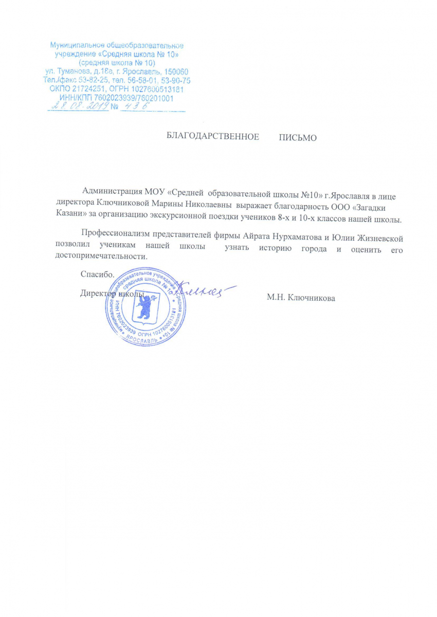 Администрация МОУ "Средней общеобразовательной школы №10" г. Ярославля в лице директора Ключниковой Марины Николаевны выражает благодарность "Загадки Казани" (ООО "Загадки Евразии")  за организацию экскурсионной поездки учеников 8-х и 10-х классов нашей школы