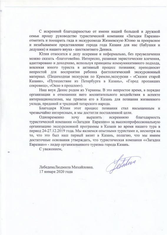 С искренней благодарностью от имени нашей большой и дружной семьи прошу руководство туристическсой компании "Загадки Евразии" отметить и поощрить гида и экскурсовода Жизневскую Юлию за прекрасное и незабываемое представление города Казани для нас (бабушки и дедушки) нашего внука - шестилетнего Дениса.