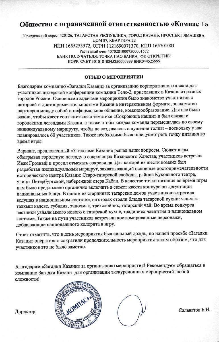 Благодарим «Загадки Казани» за организацию мероприятия! Рекомендуем обращаться в компанию Загадки Казани для организации экскурсионных мероприятий любой сложности!