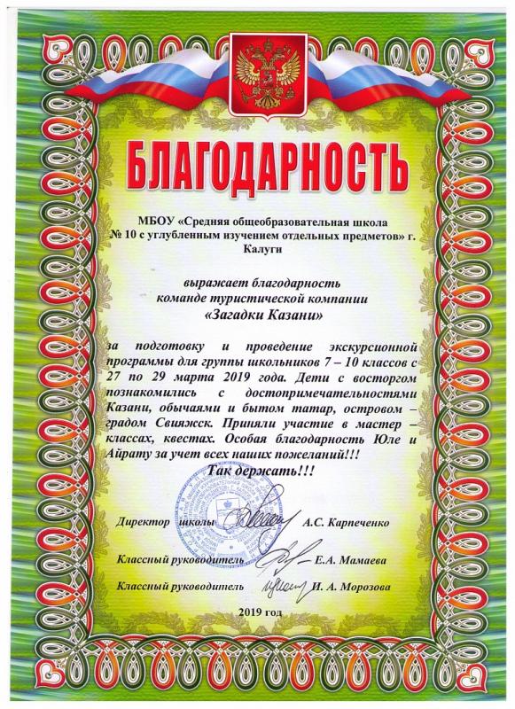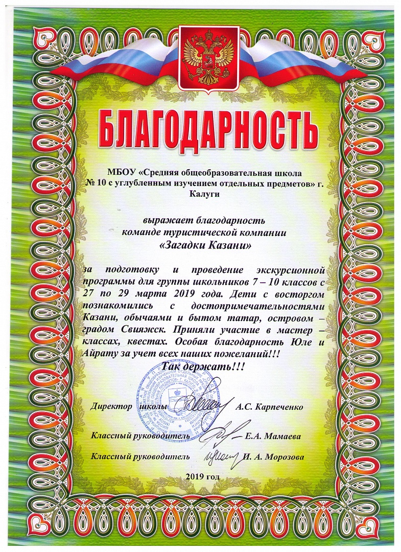 МБОУ "Средняя общеобразовательная школа №10 с углубленным изучением отдельных предметов" г. Калуги выражает благодарность команде туристической компании "Загадки Казани" за подготовку и проведение экскурсионной программы для группы школьников 7-10 классов с 27 по 29 марта 2019 года. Дети с восторгом познакомились с достопримечатями Казани, обычаями и бытом татар, островом-градом Свияжск. Приняли участие в мастер-классах, квестах. Особая благодарность Юле и Айрату за учет всех наших пожеланий!!! Так держать!!!