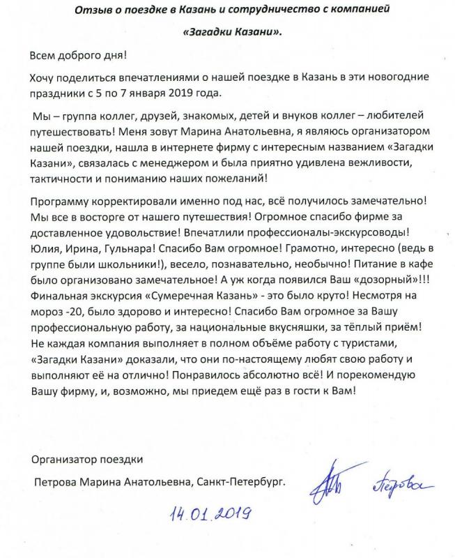 С искренней благодарностью от имени нашей большой и дружной семьи прошу руководство туристическсой компании "Загадки Евразии" отметить и поощрить гида и экскурсовода Жизневскую Юлию за прекрасное и незабываемое представление города Казани для нас (бабушки и дедушки) нашего внука - шестилетнего Дениса.