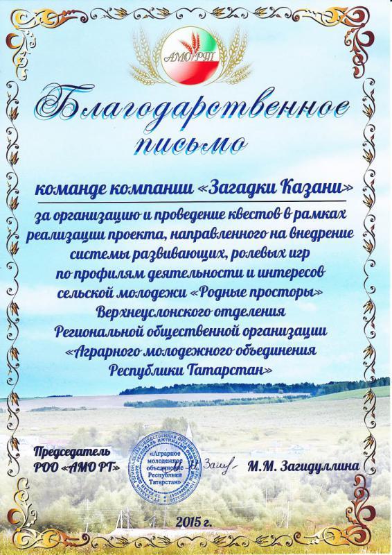Команде компании "Загадки Казани" за организацию и проведение квестов в рамках реализации проекта, направленного на внедрение развивающих, ролевых игр по профилям деятельности и интересов сельской молодежи "Родные просторы" Верхнеуслонского отделения Региональной общественной организации "Аграрного молодежного объединения Респбулики Татарстан"