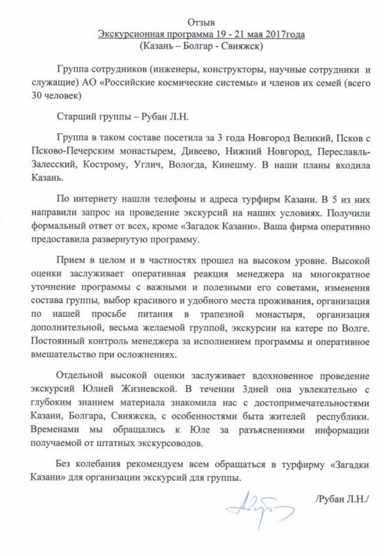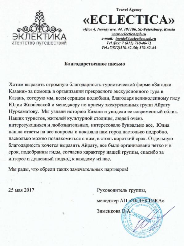 Хотим выразить огромную благодарность туристической фирме «Загадки Казани» за помощь в организации прекрасного экскурсионного тура в Казань, которую мы, всем сердцем полюбили, благодаря великолепному гиду Юлии Жизневской и менеджеру по приему экскурсионных групп Айрату Нурхаматову. Мы узнали историю Казани и увидели ее современный облик. Наших туристов, жителей культурной столицы, людей очень интересующихся и любознательных, интересовало буквально все, Юлия нашла ответы на все вопросы и показала нам город настолько подробно, насколько можно познакомиться с ним, в столь короткий срок. Отдельную благодарность хочется выразить Айрату, все было организовано четко и в срок, подобранны гиды, согласно характеру нашей группы, спасибо за интерес и душевный подход к каждому из нас. Мы рады, что обрели таких замечательных партнеров!
