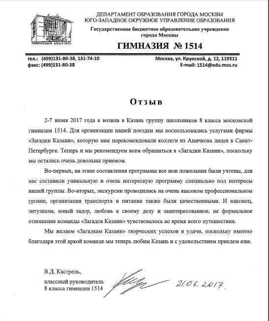 2-7 июня 2017 года я возила в Казань группу школьников 8 класса Московской гимназии 1514. Для организации нашей поездки мы воспользовались услугами фирмы "Загадки Казани", которую нам порекомендовали коллеги из Аничкова лицея в Санкт-Петербурге. Теперь и мы рекомендуем всем обращаться в "Загадки Казани", поскольку мы остались очень довольны приемом.