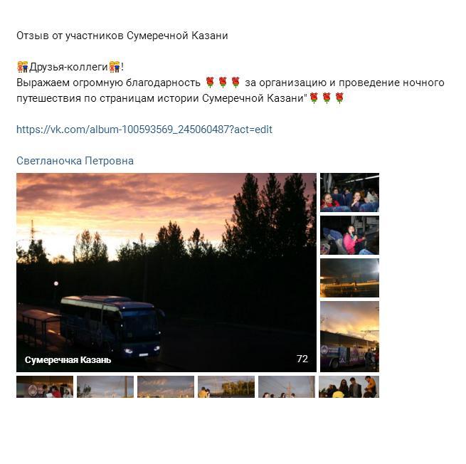 Добрый день… Вчера у нас был насыщенный день, принимали участие в двух экскурсиях — обзорная трёхчасовая и ночная… Хочется выразить своё восхищение нашими экскурсоводами — Еленой Эдуардовной и Зилей, которые на высшем уровне провели нас по запланированным местам. Хочется отметить хорошее знание темы, прекрасный слог, знание истории города, узнали много подробностей, которых вряд ли найдёшь «в учебниках»… Вообщем, скучать не пришлось… Спасибо! Да и вообще персонал вашей компании очень приветливый, отзывчивый, несколько раз общались с оператором Юлей и менеджером Айратом. Браво!!! Буду всем рекомендовать контакт с вами… С уважением…