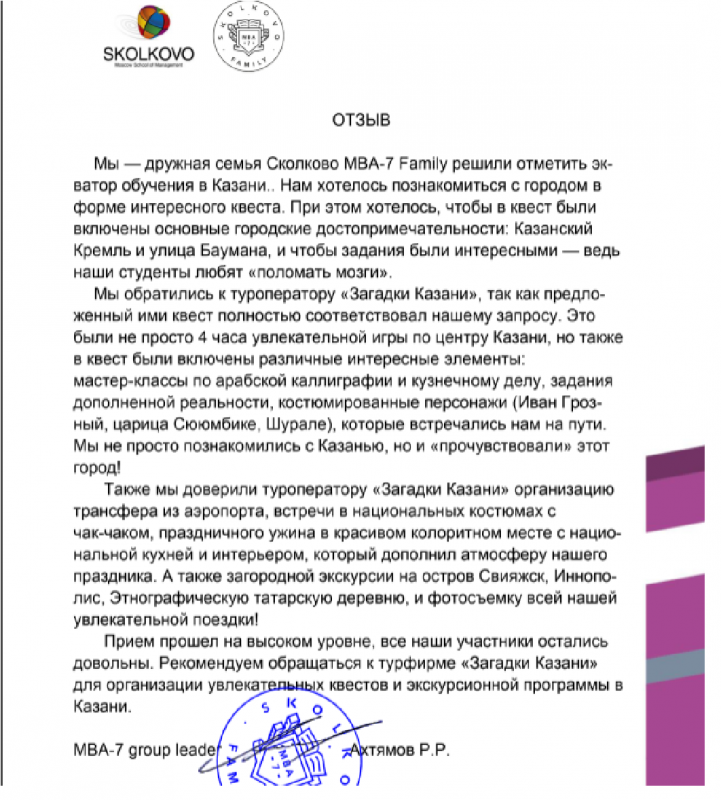 По интернету нашли телефоны и адреса турфирм Казани. В 5 из них направили запрос на проведение экскурсий на наших условиях. Получили формальный ответ от всех, кроме «Загадок Казани». Ваша фирма оперативно предоставила развернутую программу.
