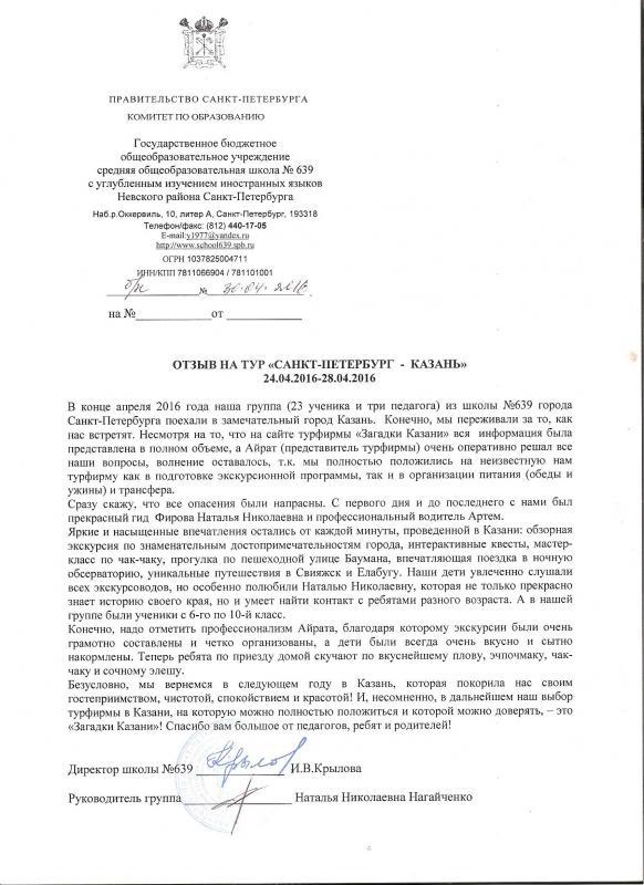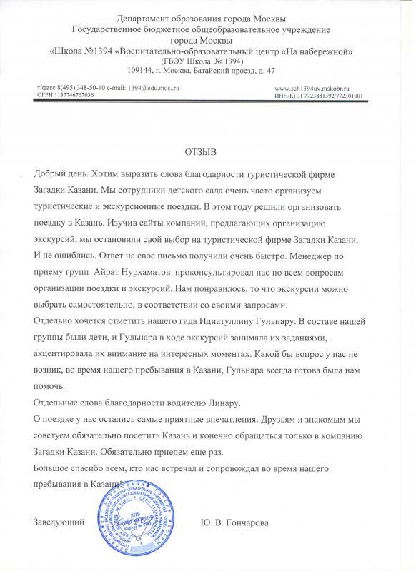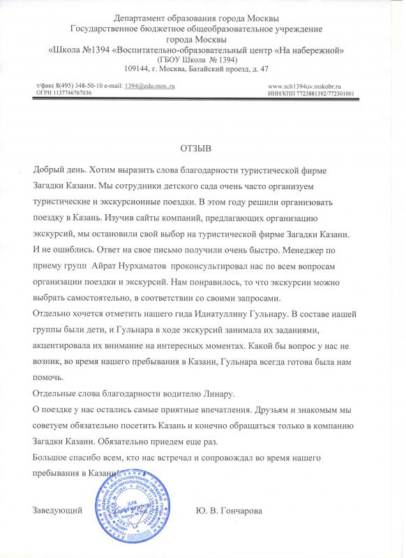 Администрация государственного бюджетного образовательного учреждения города Москвы «Школа № 825», классный руководитель и родители 7 класса «А» благодарят туристическую фирму «Загадки Казани» за прекрасно организованное знакомство с Казанью и ее окрестностями, интересную, разнообразную и насыщенную экскурсионную программу.