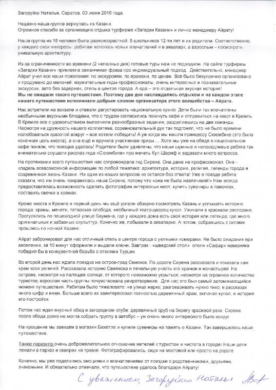 Добрый день. Хотим выразить слова благодарности туристической фирме Загадки Казани. Мы сотрудники детского сада очень часто организуем туристические и экскурсионные поездки. В этом году решили организовать поездку в Казань. Изучив сайты компаний, предлагающих организацию экскурсий, мы остановили свой выбор на туристической фирме Загадки Казани. И не ошиблись. Ответ на свое письмо получили очень быстро. Менеджер по приему групп Айрат Нурхаматов проконсультировал нас по всем вопросам организации поездки и экскурсий. Нам понравилось, то что экскурсии можно выбрать самостоятельно, в соответствии со своими запросами.