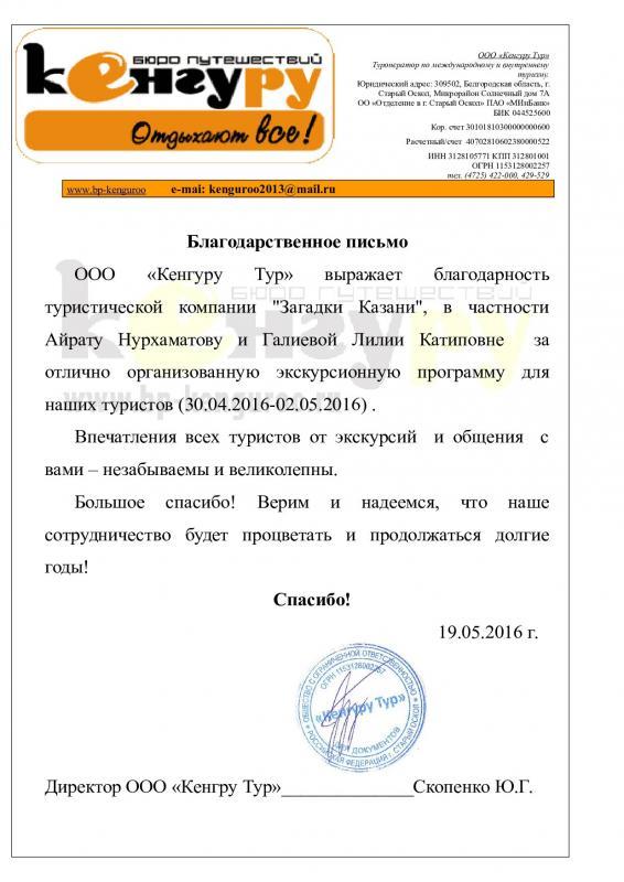 ООО «Кенгуру Тур» выражает благодарность туристической компании "Загадки Казани", в частности Айрату Нурхаматову и Галиевой Лилии Катиповне за отлично организованную экскурсионную программу для наших туристов (30.04.2016-02.05.2016) .
